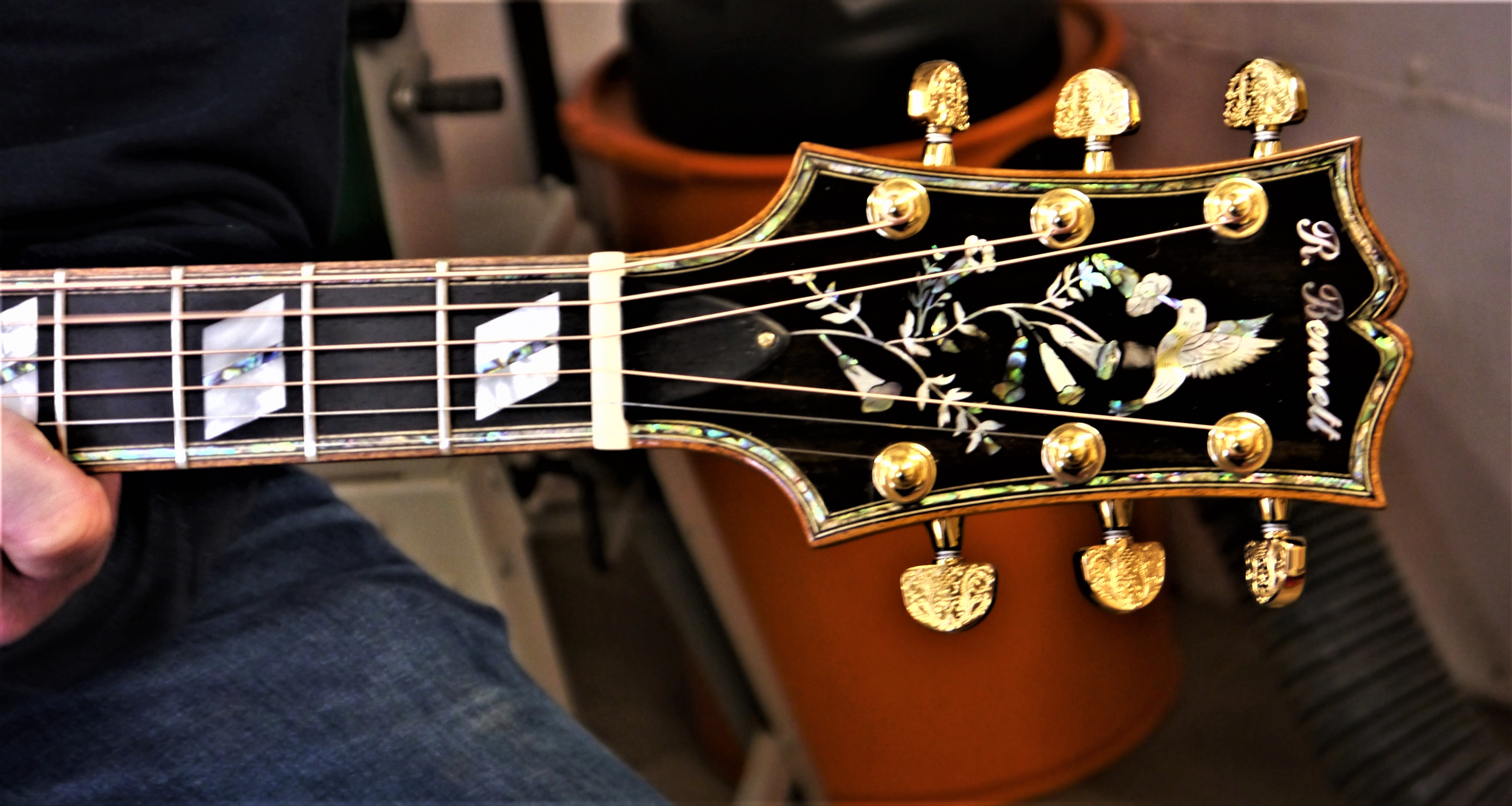 Russell Bennett is no salesman, he’s an instantly likeable man whose work is his love and his guitars sound as affecting as his back-story. In short, they have a soul with a capital S. He was reluctant to name drop but when pressed Russell told me a couple of stories. He said that late one night in the 1990s a tour bus pulled up at his home – it was Aussie band Crowded House who had been told about his work and after a beer or two parted with a substantial amount of cash in exchange for one of his guitars. Another of his customers is in demand session musician Greg Bone (Sting, Mick Jagger, Kylie Minogue, Ronan Keating) who told me, ‘I met Russell a very long time ago when he repaired my guitar, we became fast friends and then I moved to London to pursue a career as a session guitarist – our paths didn’t cross for about 30 years but when we met again it was like those years disappeared in an instant. His craftsmanship was top class back then and now it is absolutely off the scale. His guitars are truly astounding in terms of tone and playability and the fact that he builds them with wood sourced from a UNESCO World Heritage Site absolutely knocks me out. Who wouldn’t want an instrument made from ancient wood re-claimed from Durham Cathedral and constructed by a first-class guitar-maker like Russell Bennett’?
